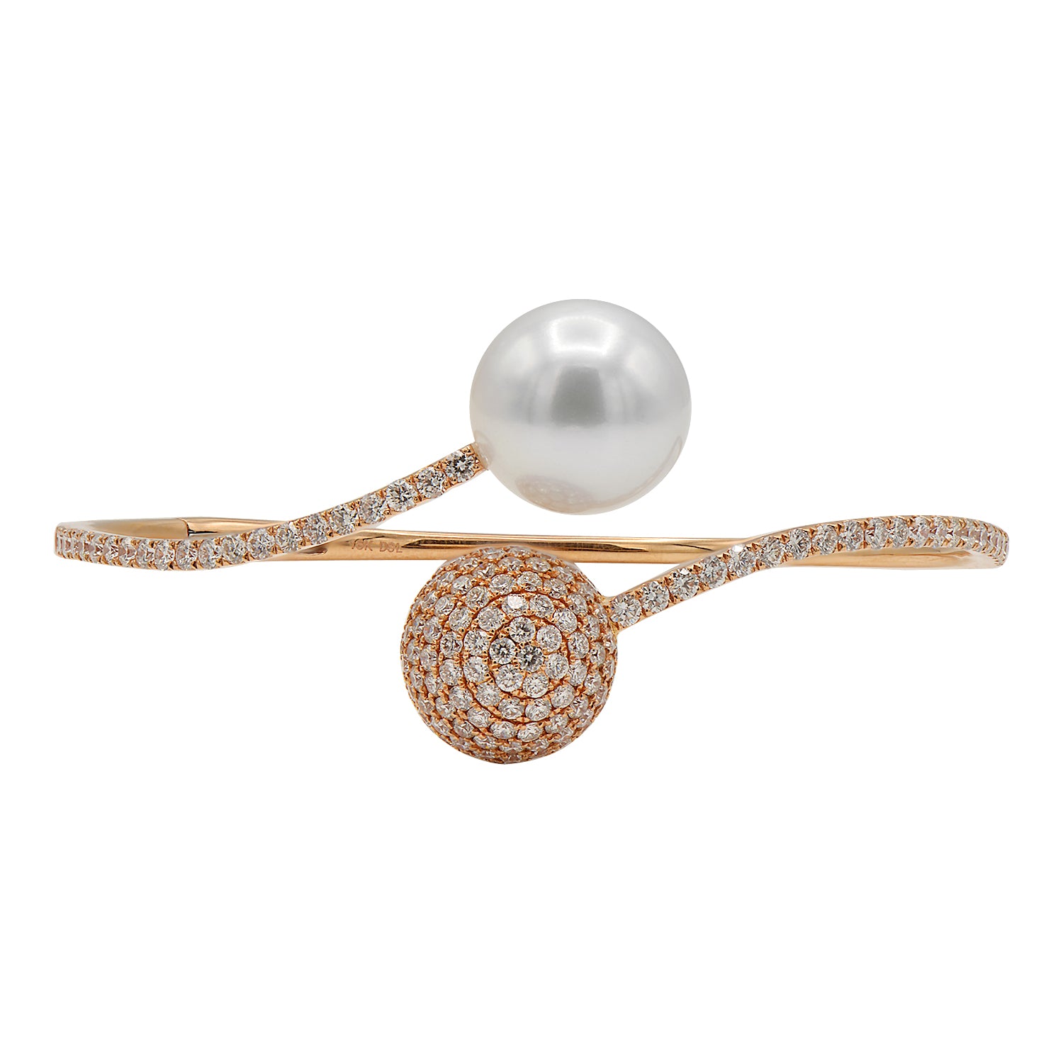Our Freshwater pearl bangle is not your typical piece due to its beautiful art-nouveau-esque curves. Also, be sure to look at another unique piece of ours, our uniquely gorgeous mid-century modern “frame” diamonds, pearls, and jade earrings.