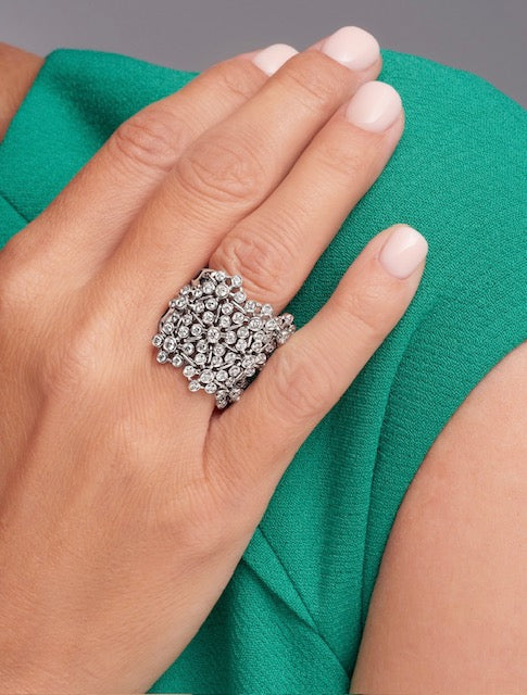 The Diamond Flower Ring is a stunning piece of jewelry that captures the essence of nature's beauty in a delicate and refined design. Crafted from 18KT white gold, this ring features a captivating arrangement of brilliant round diamonds, meticulously crafted to resemble blossoming flowers.