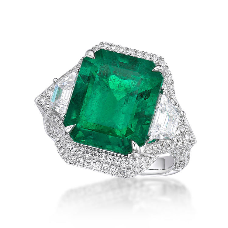 The intensity of the verdant hues of an emerald have mesmerised the world for eons. From dainty to larger statement stones, such as this piece weighing in at close to nine carats in Emerald alone, a high-quality emerald makes for a staggering presence. Perfectly paired with over two carats of diamonds, this ring represents the ultimate form of art and craftsmanship.