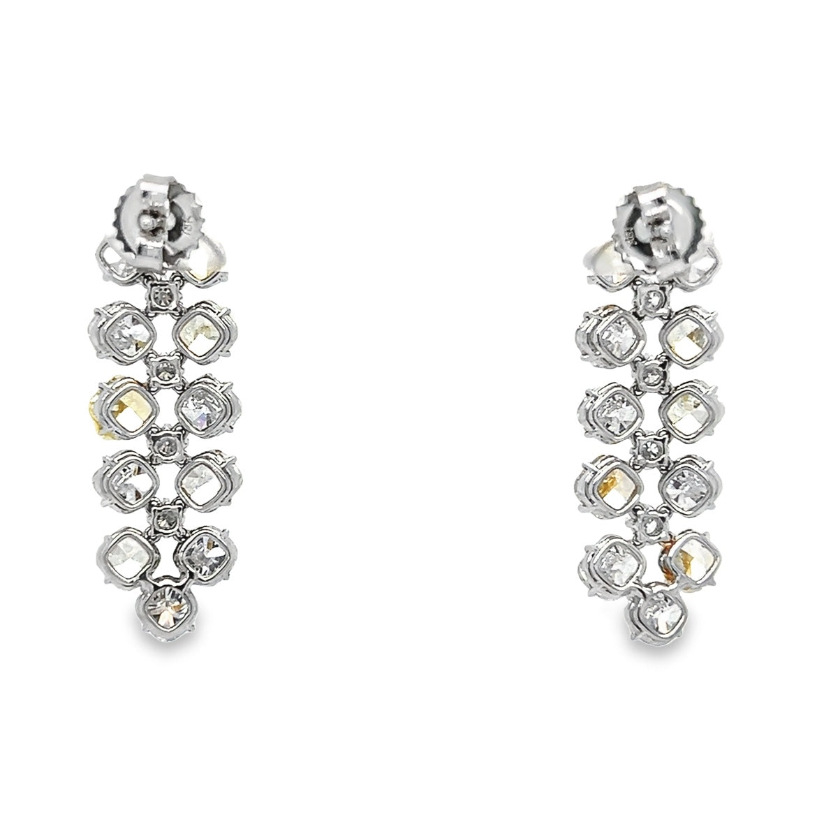 These exquisite earrings feature a stunning combination of cushion-cut yellow and white diamonds and brilliant round natural white diamonds, meticulously set in luxurious 18KT white gold. Each earring has 5 yellow diamonds and 10 white diamonds in a design that makes it look like a waterfall of sparkle.