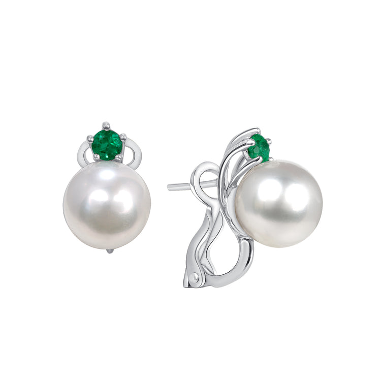 These earrings feature a classic and refined design, combining the timeless beauty of pearls with the vibrant allure of emeralds. Each earring is adorned with a brilliant round pearl. The pearls have a lustrous surface, providing a luxurious and iridescent quality. Complementing the pearls and adding a pop of color are two brilliant round emeralds.