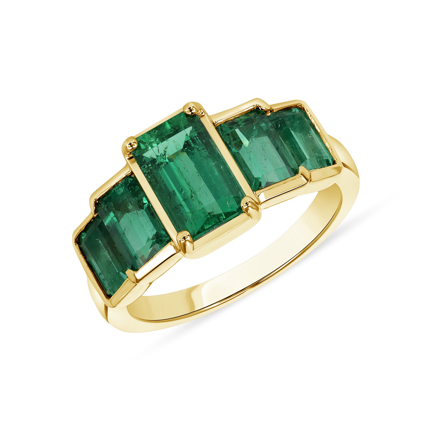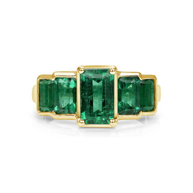 Make others green with envy when they see this yellow-gold bezel set emerald ring. Consisting of 5 baguette emeralds, this cut gives it more of a sophisticated and elegant look to the ring. Each emerald is delicately bezel set in 18KT yellow gold.