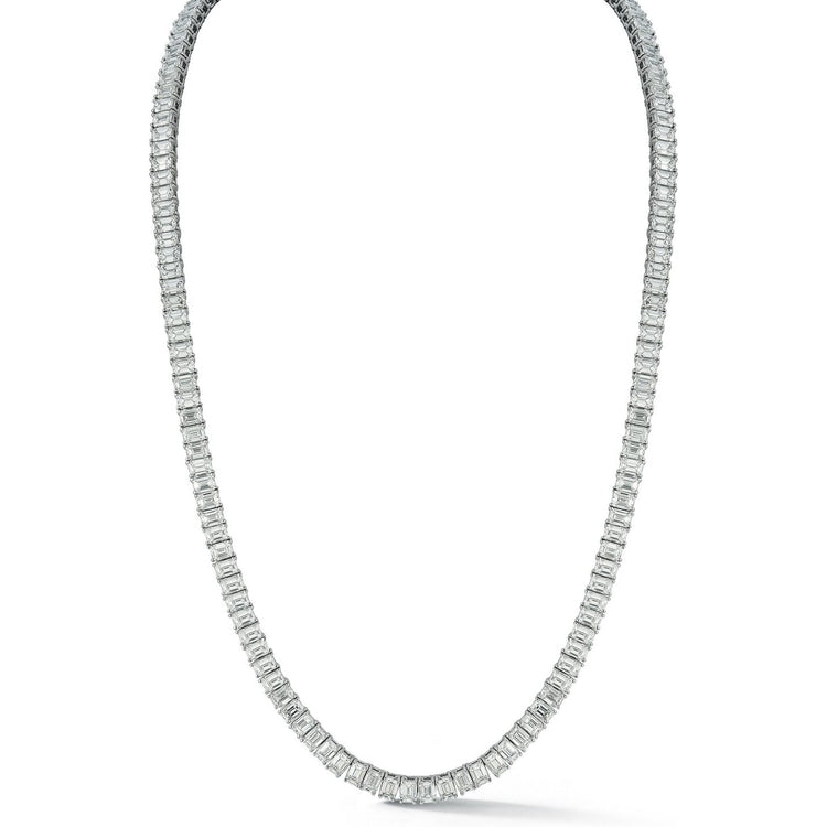 This extraordinary necklace features a breathtaking array of 146 emerald-cut natural white diamonds. Set in 18KT white gold, the setting enhances the radiant sparkle of the diamonds while providing a timeless and elegant backdrop. Perfect for adding a touch of glamour to any ensemble, this exquisite necklace is sure to captivate and enchant on any occasion.