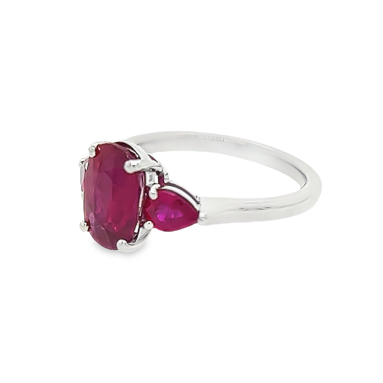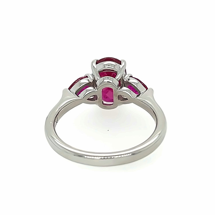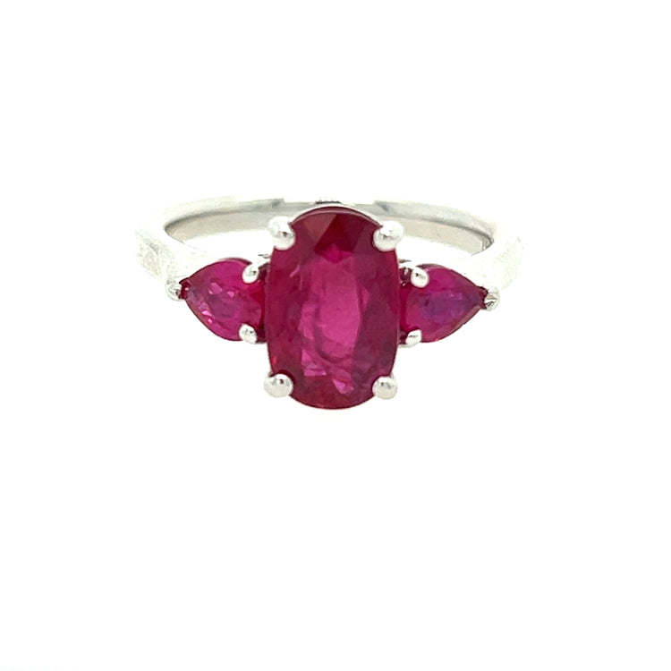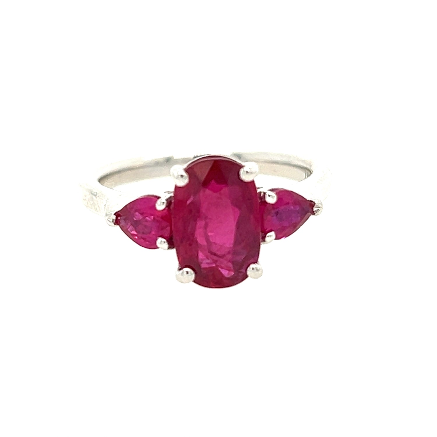 This gorgeous three-stone ruby ring is truly a piece of art. At the heart of the ring is an oval cut Mozambique ruby, known for its intense color and strong fluorescence. This ruby is also GRS-certified, solidifying its authenticity. To add to the magnificence, there are two more pear-cut rubies on both sides of the focal point.
