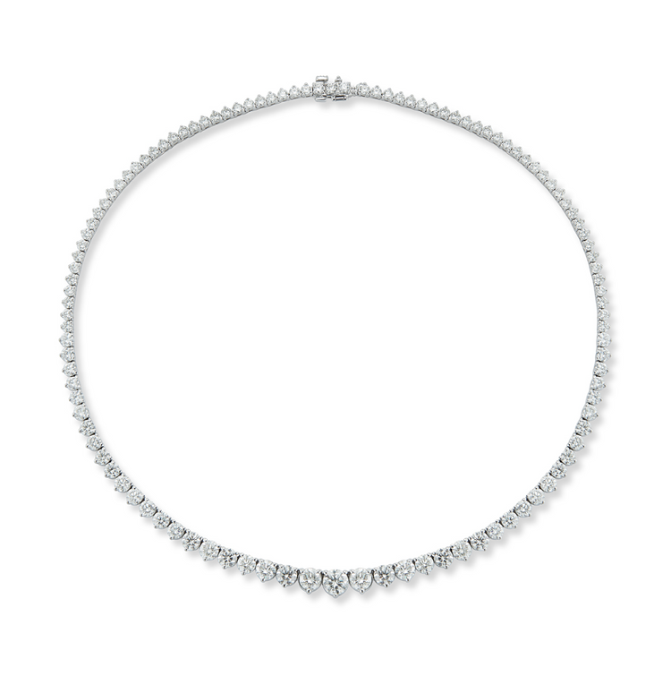 Featuring 129 brilliant round natural white diamonds, each stone is expertly set in a classic three-prong setting that allows maximum light to enhance its fire and sparkle. The graduated design creates a graceful flow of diamonds that gently increase in size toward the center, offering a flattering and luxurious silhouette along the neckline.