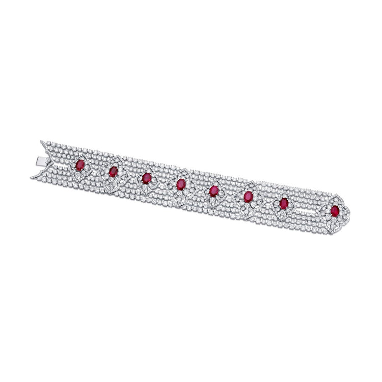 Add a feeling of elegance with this diamond and ruby bracelet. Your wrist will be adorned with over 670 brilliant round white diamonds, making sure to shine wherever the light hits it. Topping it off with a touch of regalness are 8 oval cut rubies, evenly laid out on the bracelet and set in 18-karat white gold along with the diamonds.