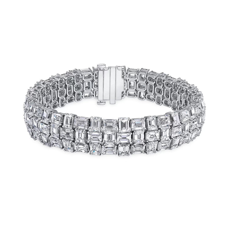 This bracelet is an extraordinary display of luxury, featuring a total of 38.50 carats of emerald-cut diamonds. Each diamond is meticulously selected for its exceptional quality, falling within the D-F color range, indicating a colorless and pure appearance. The emerald-cut diamonds are set in a crisscross pattern, creating a unique and intricate design that adds to the bracelet's allure.