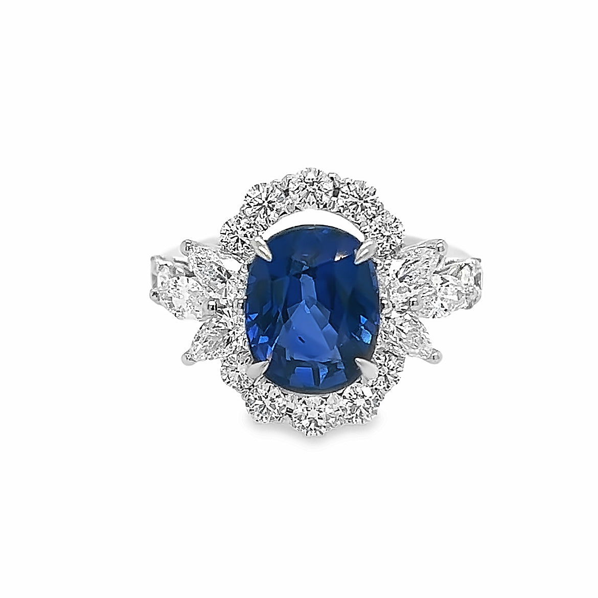 This ring showcases a magnificent 3.5-carat sapphire from Ceylon, known for its exceptional quality and rich, vibrant blue hue, enhanced through traditional heat treatment. Complementing the sapphire, 1.5 carats of brilliant white diamonds encircle the centerpiece as well as partly on the band, adding an extra layer of sparkle and luxury.