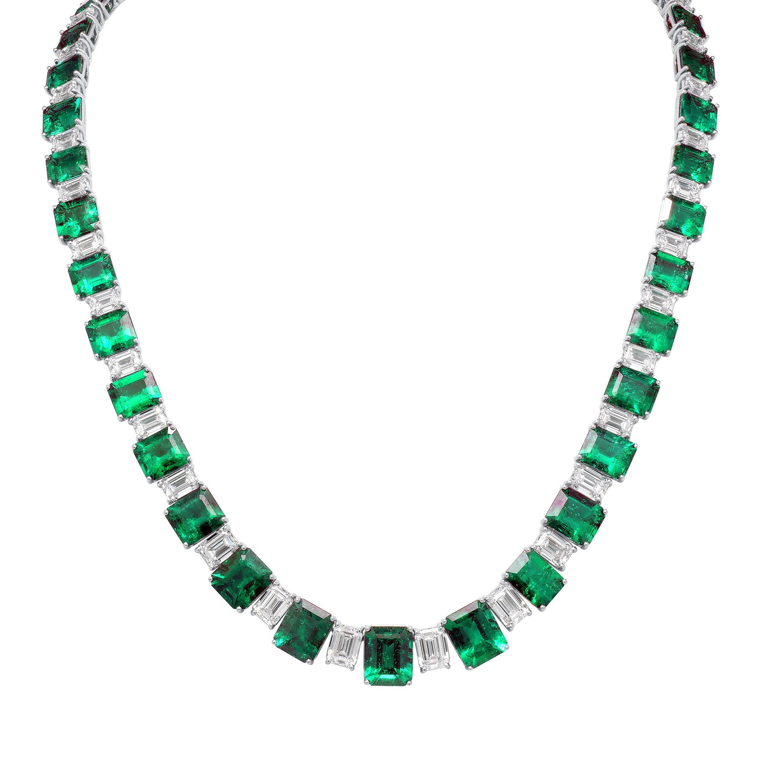 Experience the beauty and elegance of emeralds and diamonds in this exquisite necklace. Certified C. Dunaigre emeralds of this clarity and size are a rare find alone, and this necklace features 39 of them. Transitioning between the emeralds are 39 emerald-cut white diamonds. This necklace is the pinnacle of perfection.