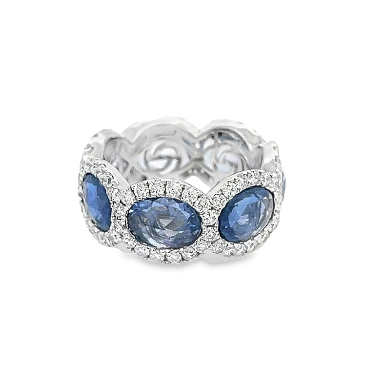 This exceptional band features mesmerizing oval-cut blue sapphires, each handpicked for its deep hue and exceptional clarity. Complementing the sapphires are brilliant round natural white diamonds, adding a radiant sparkle to the design. The sleek and modern design highlights the beauty of the gemstones, while the white gold setting ensures their security and longevity.