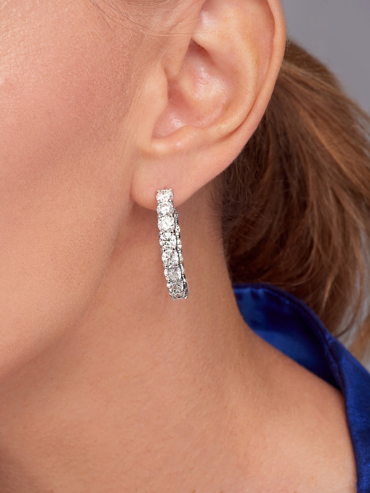 The unique U-prong setting adds a contemporary touch to these classic hoop earrings, ensuring that each diamond is prominently displayed, allowing for maximum light refraction and creating an alluring play of sparkle and fire.