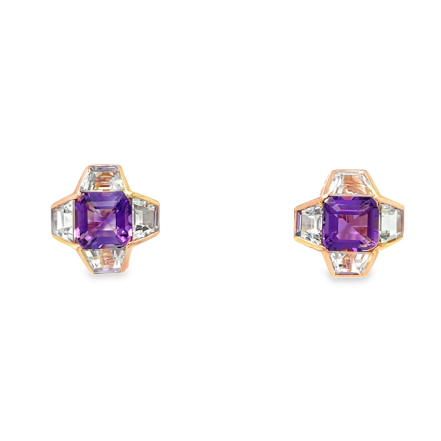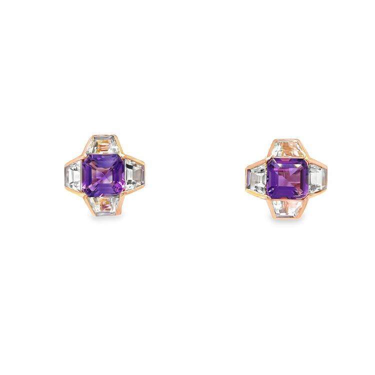 A striking interplay of color and geometry, these amethyst and blue topaz earrings are crafted in a sophisticated combination of platinum and 18KT rose gold. Featuring two square-cut amethysts, each framed by four trapezoid-cut blue topaz gemstones, the design showcases clean architectural lines softened by luminous color and warm metal contrast.