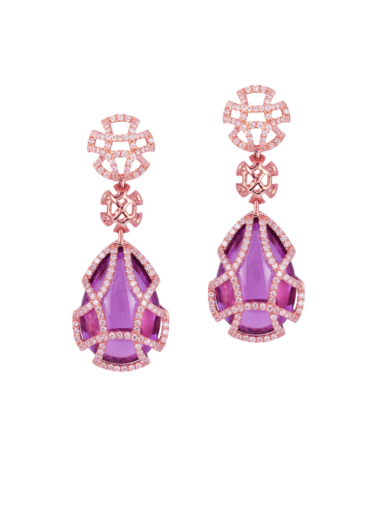 Bold and elegant, these drop earrings steal the spotlight. Featuring teardrop shaped amethysts, weighing over 14 carats each, accented with diamond-embedded cage detailing. Elevate your look with this beautiful set.