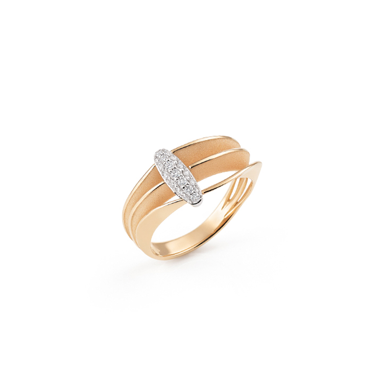 The Annamaria Cammilli Three Layer Chic Pavé Diamond Dune Ring in 18K gold features a modern three-layer design with chic pavé detailing. Adorned with white diamonds, this ring offers a blend of contemporary elegance and refined luxury.