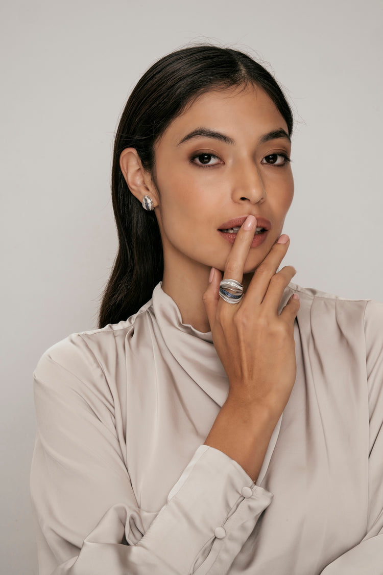 The Annamaria Cammilli Six Layer Diamond and Blue Sapphire Velaa Color Ring in 18K gold features a captivating design with layers that elegantly showcase a blend of white diamonds and vibrant blue sapphires. This ring offers a unique and sophisticated combination of colors, perfect for adding a touch of luxurious charm to any ensemble.