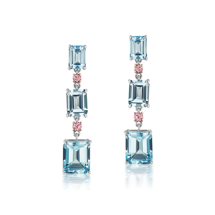Each aquamarine gemstone, known for its serene blue hue reminiscent of the ocean's depths, is carefully selected for its clarity and brilliance. Set in lustrous white gold and rose gold, the gemstones are meticulously positioned to maximize their sparkle and allure. The streamlined silhouette and timeless design make these earrings perfect for any occasion.