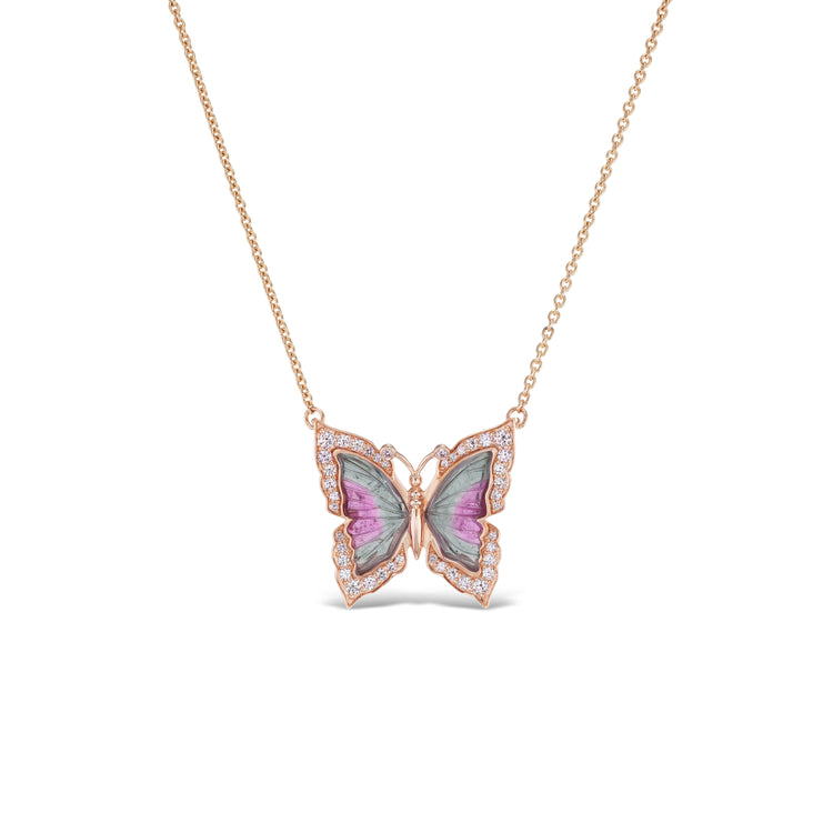 The delicate wings of the butterfly showcase the mesmerizing hues of the tourmaline, transitioning from shades of pink to green, creating a captivating ombré effect. Each gemstone is meticulously selected for its color, clarity, and brilliance, ensuring a dazzling display of light and color with every movement. This exquisite necklace is a symbol of transformation and grace, perfect for adding a touch of whimsy and sophistication to any ensemble.