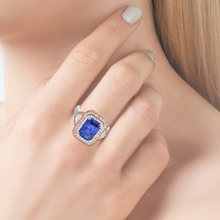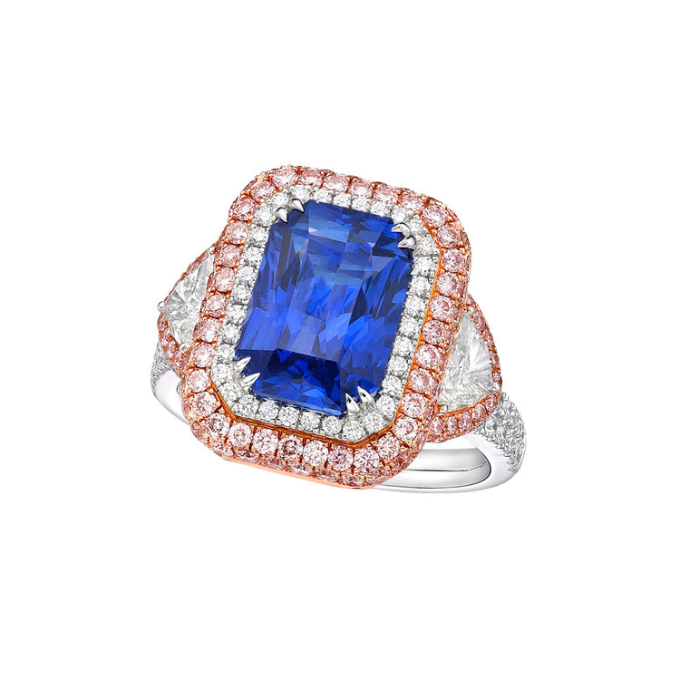 This ring consists of colors galore! Taking main stage, the 6CT sapphire is a gorgeous blue and surrounded by a halo of bright white diamonds. Adding the extra pop of color are pink diamonds, emphasizing the white and giving a halo to the side stones.