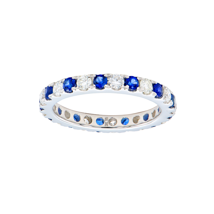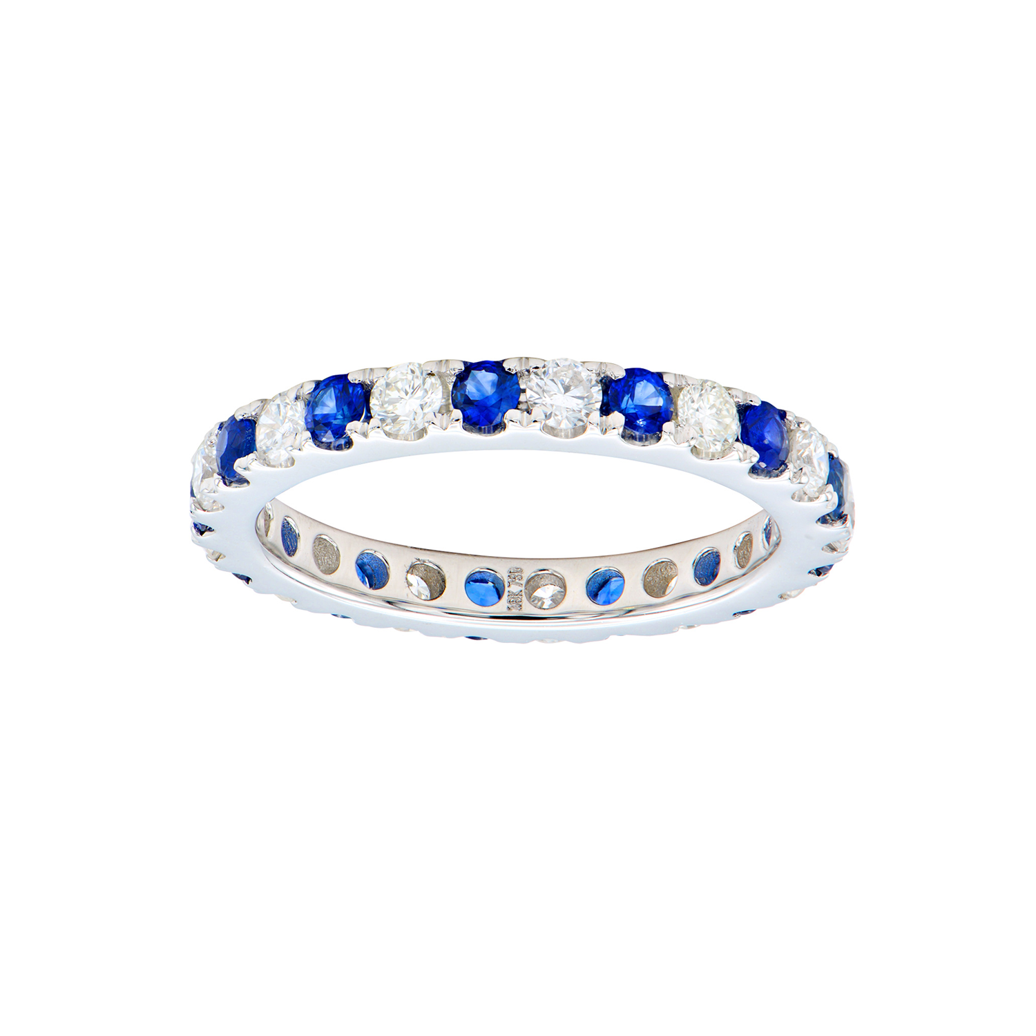 Scintillating sapphires and sparkling diamonds are alternatively set in this full eternity band, offering spectacular contrast.