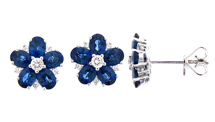 Blue Sapphire and White Diamond Flower Stud Earrings