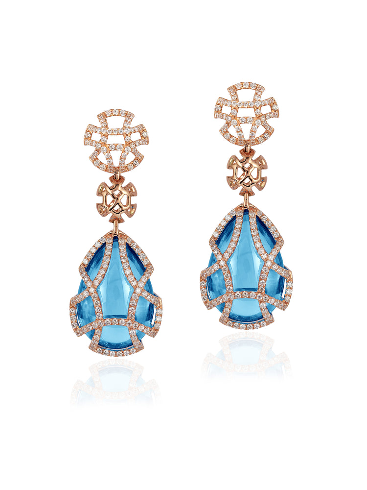 Bold and elegant, these drop earrings steal the spotlight. Featuring teardrop shaped blue topaz, weighing over 18 carats each, accented with diamond-embedded cage detailing. Elevate your look with this beautiful set.