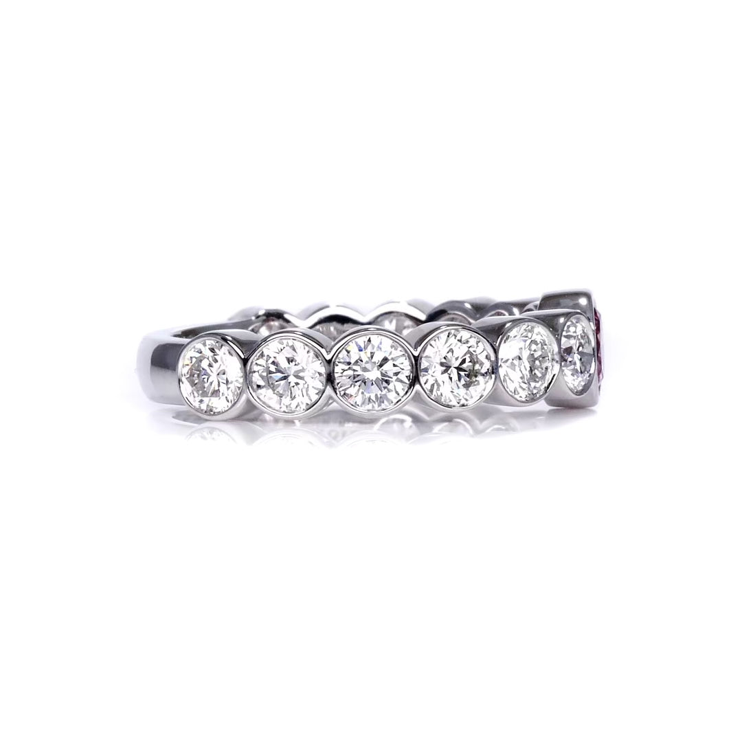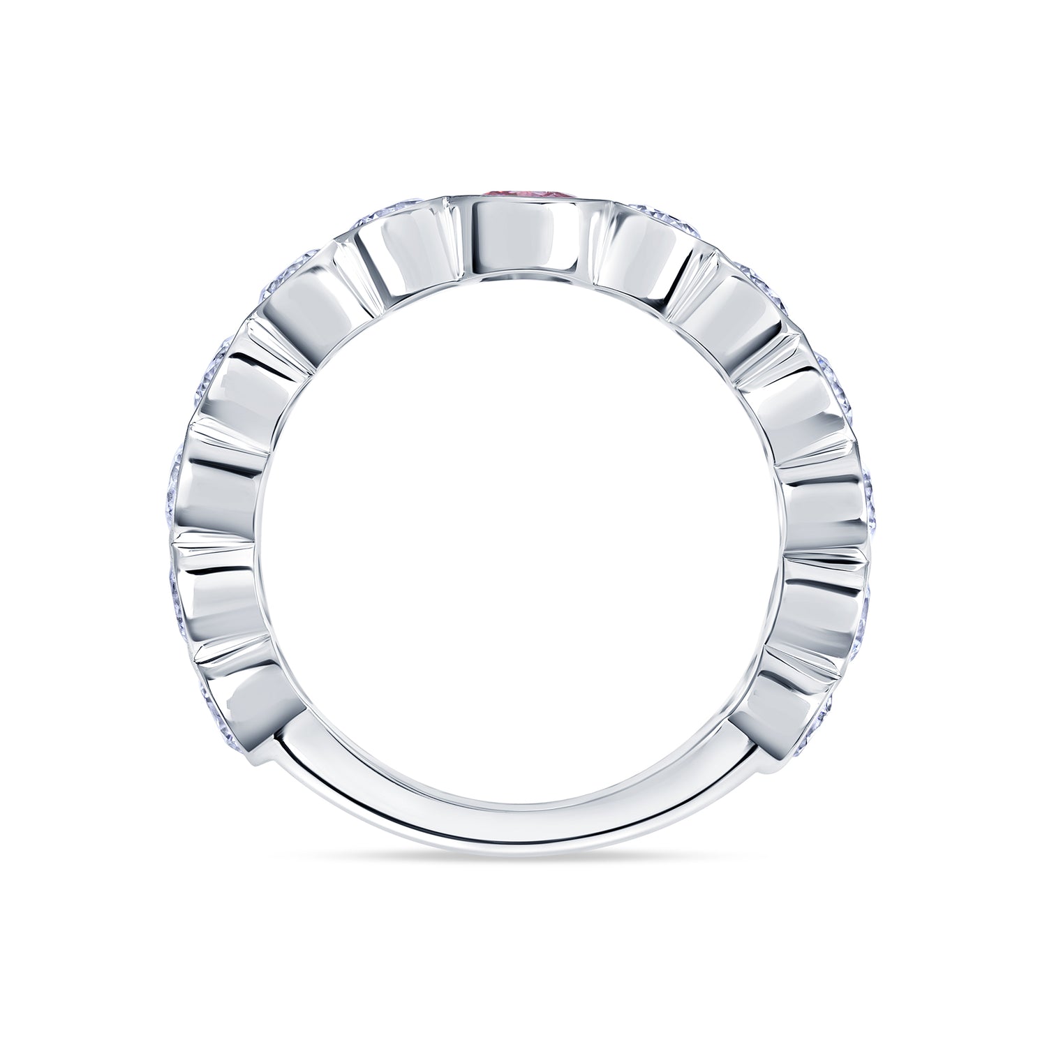 Understated yet unforgettable, this halfway eternity band centers a fancy intense purplish-pink Argyle diamond. Its warm, violet-kissed pink hue is flanked by bezel-set brilliant round white diamonds on each side. Crafted in white gold, the smooth bezel settings create a seamless, modern finish.