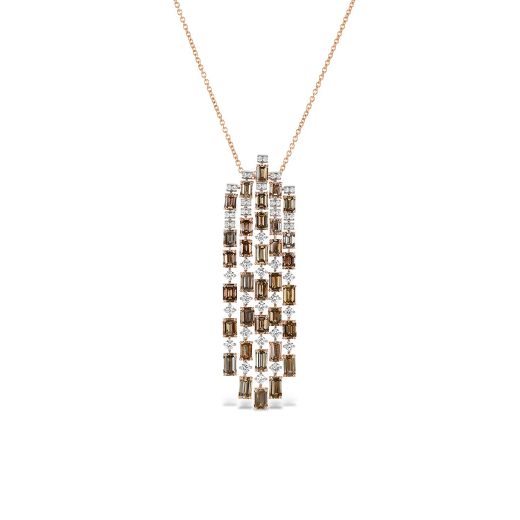 This Art Deco inspired necklace is adorned with exquisite brown emerald-cut diamonds, meticulously set in lustrous rose gold. The clean lines and geometric elegance of the emerald cut add a modern flair to this classic piece, making it a versatile addition to any jewelry collection.