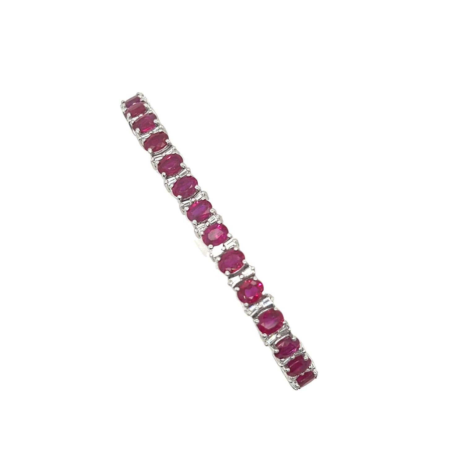 The centerpiece of the bracelet consists of 31 rubies, totaling 11.70 carats. Originating from Burma, these rubies are known for their rich, deep red color, and have undergone a heat treatment to enhance their natural beauty. Each ruby is carefully set, creating a continuous flow of color around the wrist. Accentuating the rubies are brilliant round diamonds, totaling 1.5 carats.