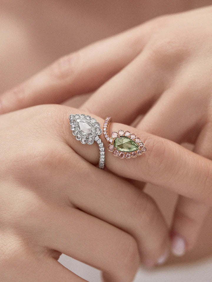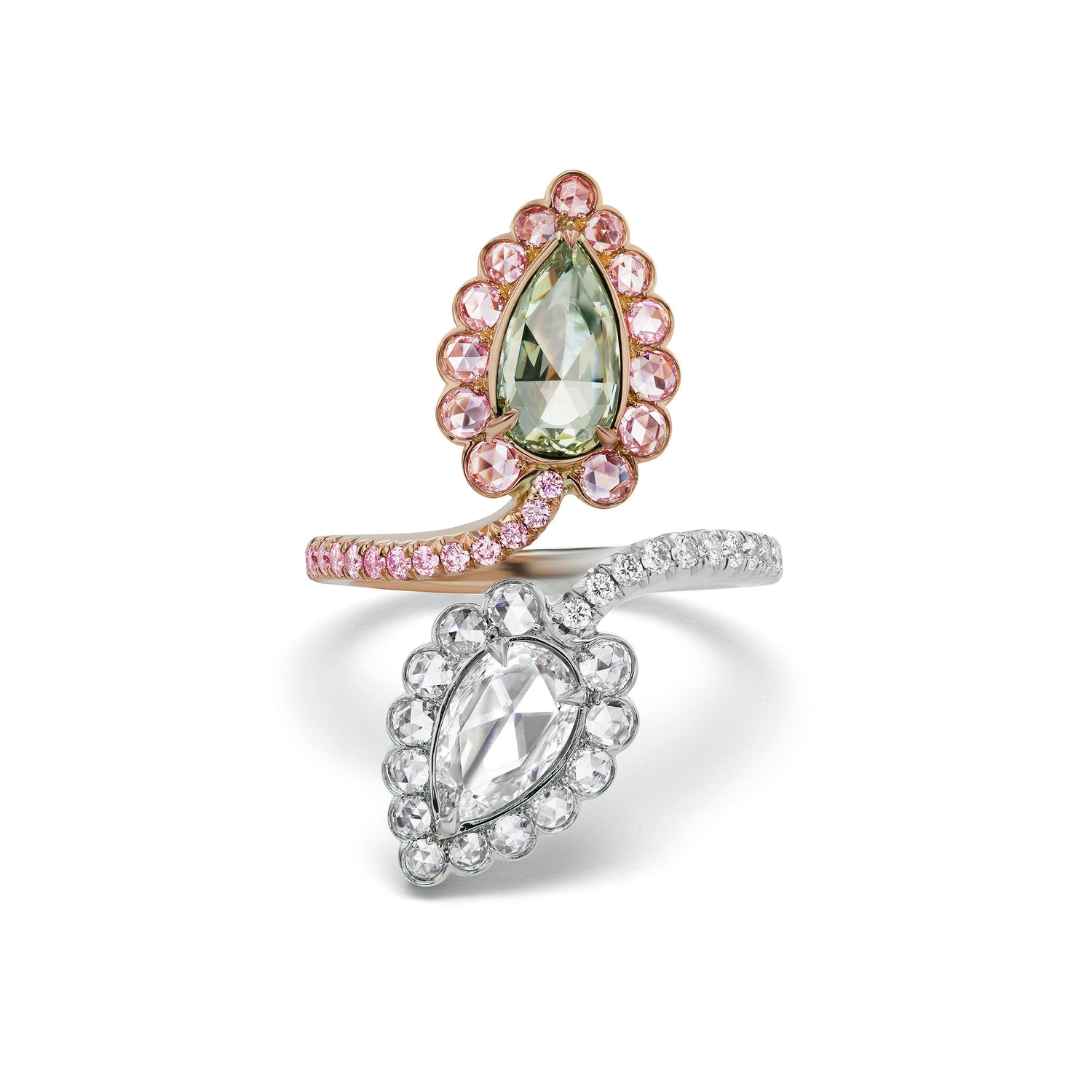 Frequently sought after by collectors, green diamonds are unparalleled in their beauty and allure. This ring features a 1 carat pear-shaped rose-cut Fancy Yellow-Green diamond filled with radiance and fire, perfectly matched with a pear-shaped rose-cut white diamond and surrounded with an array of Argyle Pink Diamonds.