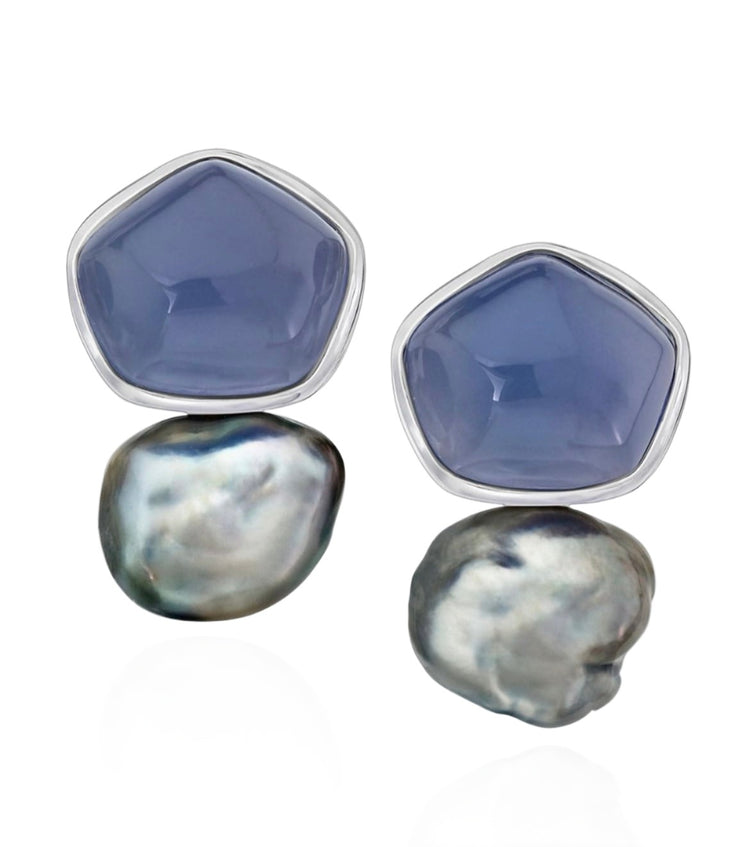 These earrings feature two exquisite Keshi Pearls, each measuring 13.3-8.5mm. Keshi pearls are known for their irregular shapes and lustrous surfaces, giving them a natural and organic charm. Accompanying the Keshi Pearls are two cabochon Namibian Chalcedony. The chalcedony, with its soothing and translucent appearance, adds a touch of color and elegance to the design.