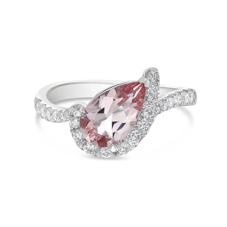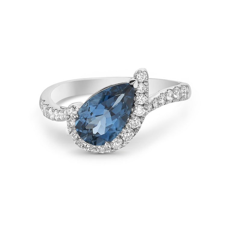 A pear-shaped aquamarine is carefully set in a cradle of brilliant white diamonds, positioned at a perfectly balanced angle that gives the design both fluidity and structure. Set in 18k white gold, this piece showcases a harmonious blend of soft color and sparkle.