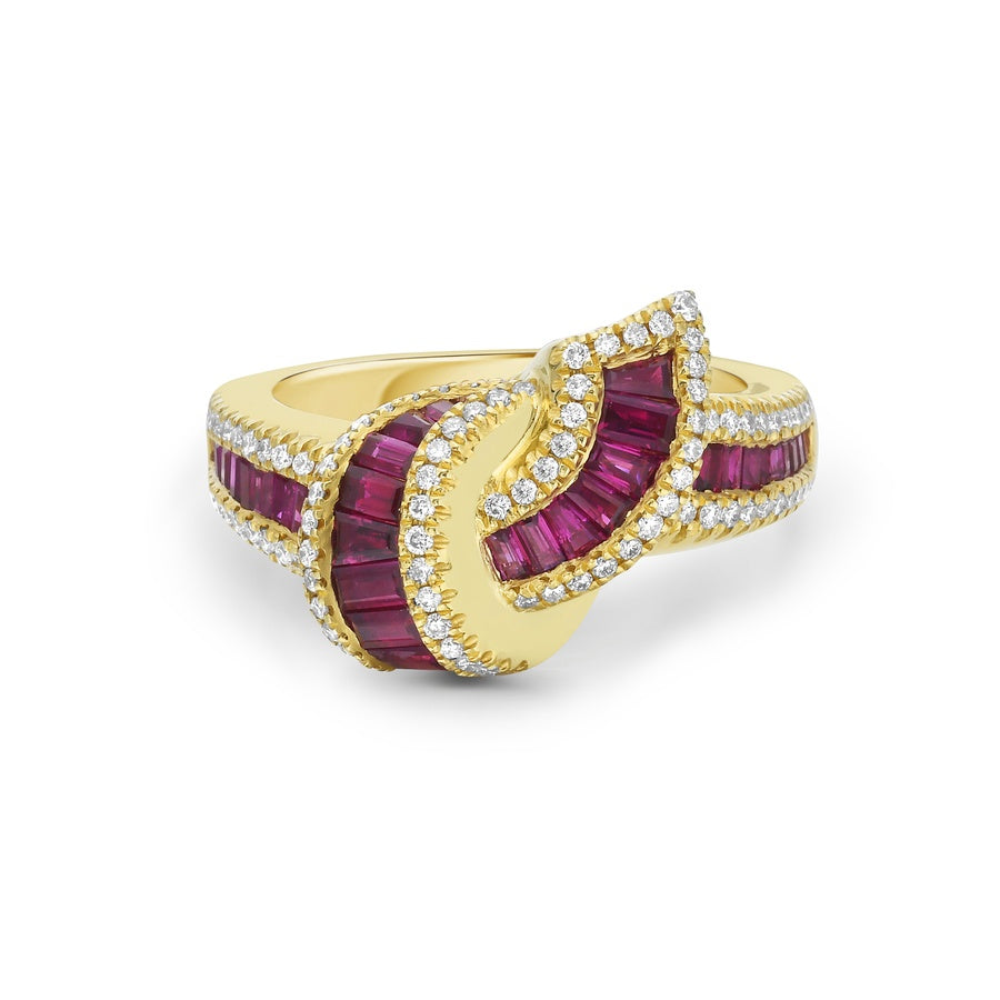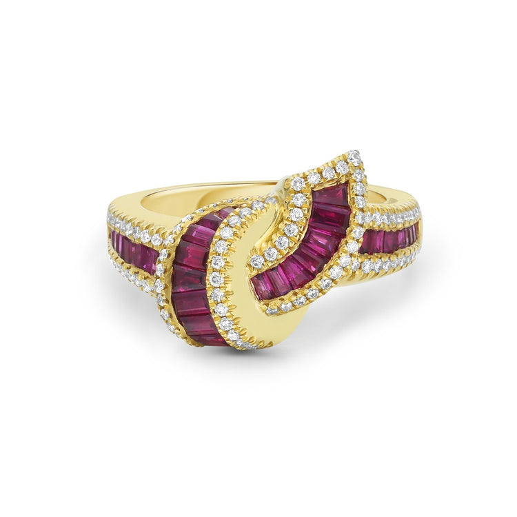 Rows of channel-set diamond baguettes, nestled between walls of brilliant round diamonds, come together in a knot of true embrace. Set in 18k white gold, this design showcases sculptural form and dimension, creating the illusion of the piece being gracefully pulled through itself.