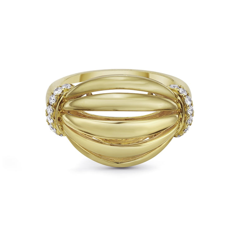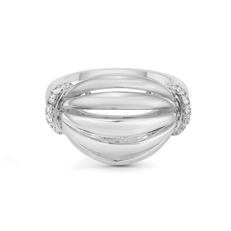 Polished, and sculpted arms of 18k white gold convex in unison to join two white diamond ties in this reflective statement ring.