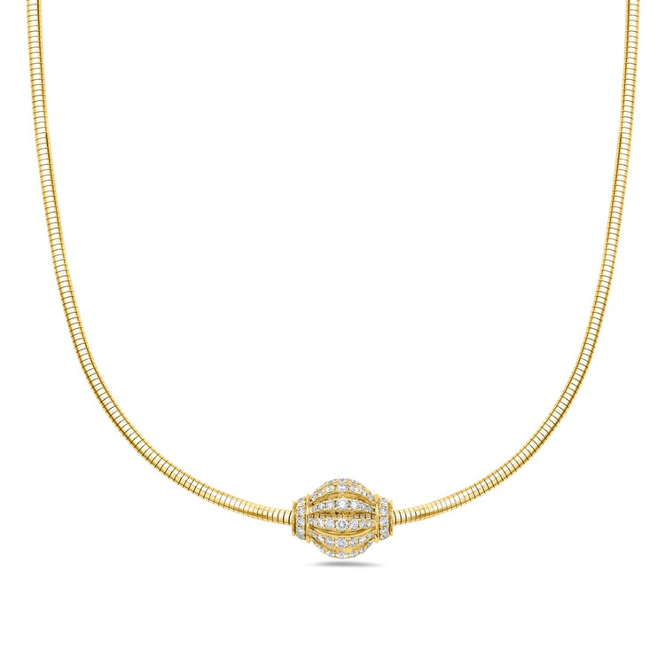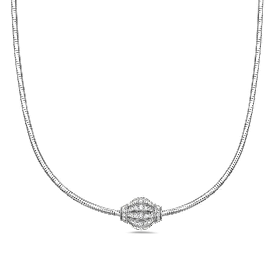 Enhance your elegance with this stunning diamond pavé birdcage rondel pendant, gracefully suspended on a sleek snake chain that beautifully complements its design. Expertly crafted in luxurious 18k white gold and adorned with brilliant diamonds, this pendant radiates from every angle, creating a captivating and timeless statement.