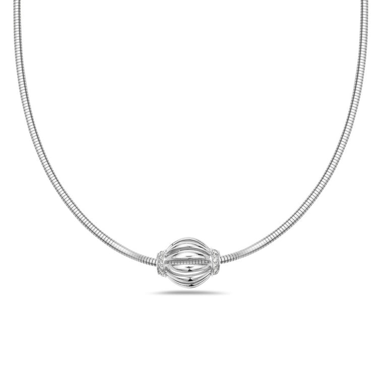Enhance your elegance with this stunning birdcage rondel pendant, gracefully suspended on a sleek snake chain that perfectly complements the design. Expertly crafted in luxurious 18k white gold, the pendant features two delicate lines of pavé diamonds that bridge the design, adding a subtle sparkle while allowing the rich gold to shine through.