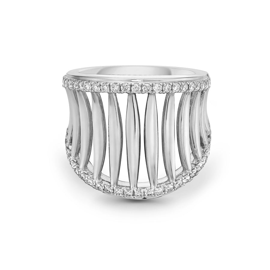 Fluted, and high polished arms of 18k yellow gold are connected by walls of brilliant white diamonds to create this spectacular statement ring. (Large Version)