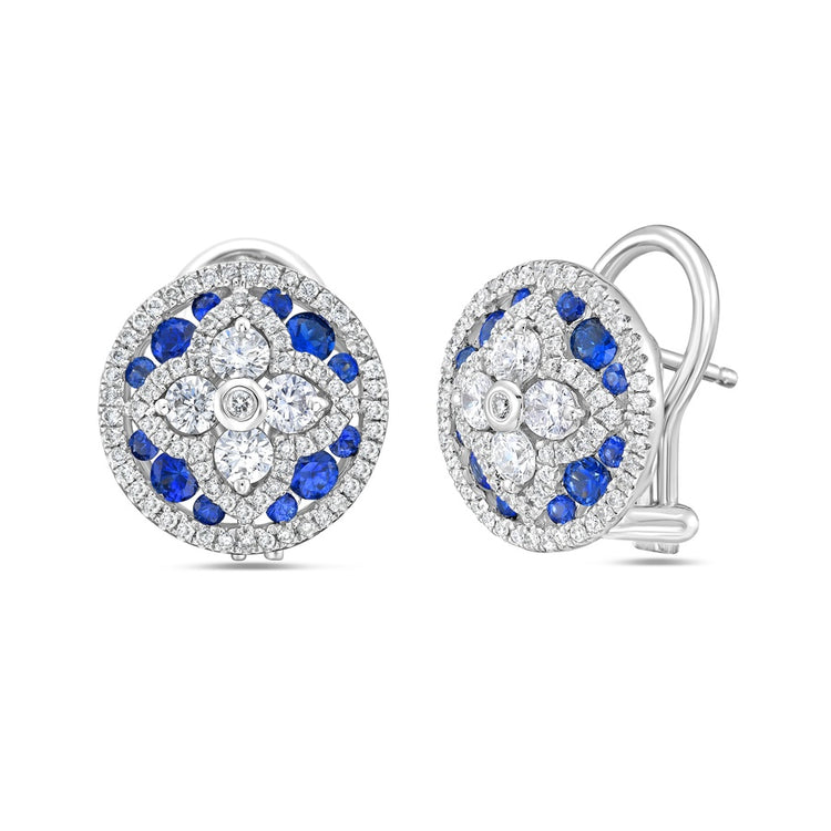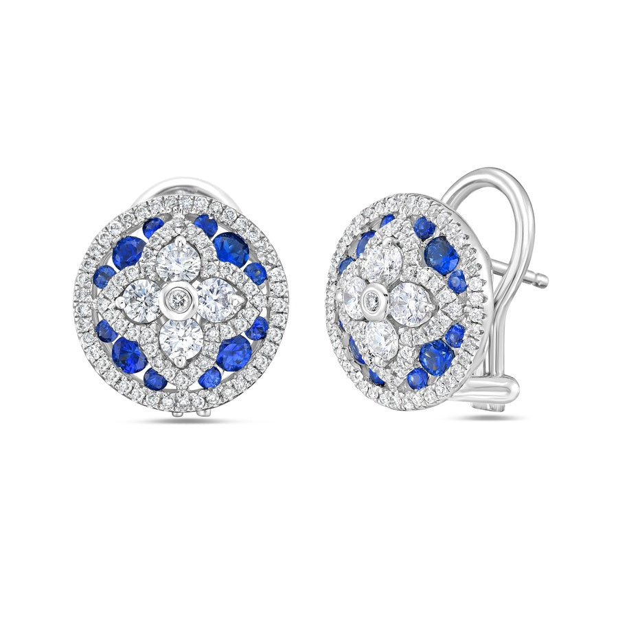 Brilliant white diamonds form a clover, accented by vivid blue sapphires and bordered by a delicate halo of white diamonds, all set in 18k white gold. This stud is a radiant blend of color and symmetry, offering a refined yet striking touch of elegance.