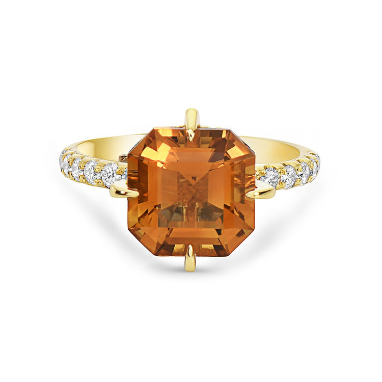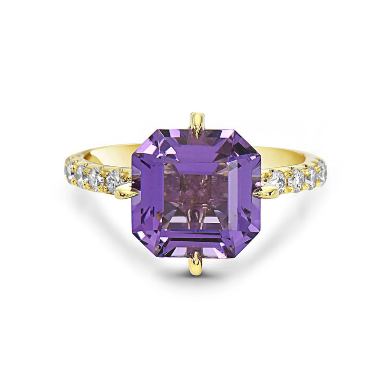 This Asscher-cut aquamarine ring features a custom-cut center stone, compass-set in 18k white gold, with brilliant white diamond accents along the shank for a refined touch of sparkle and sophistication.
