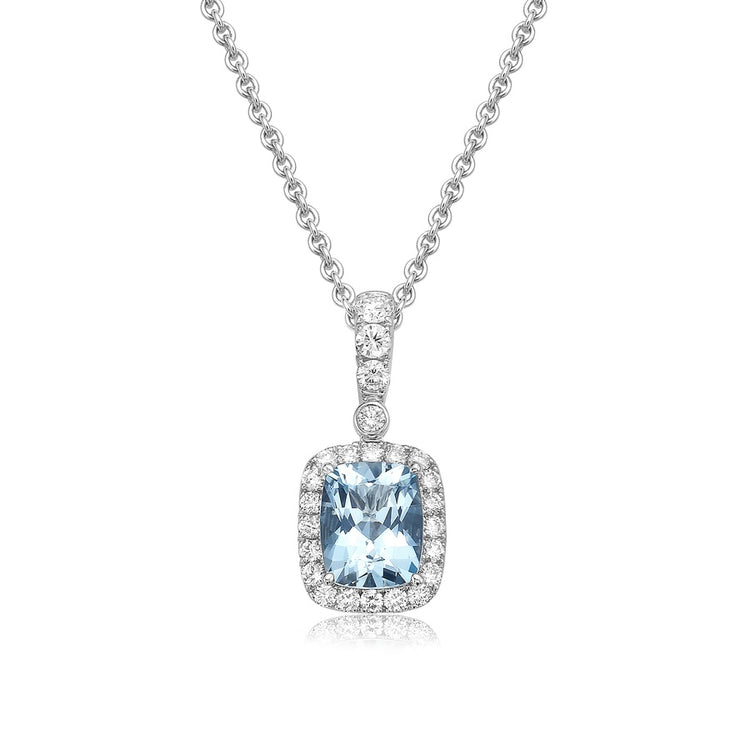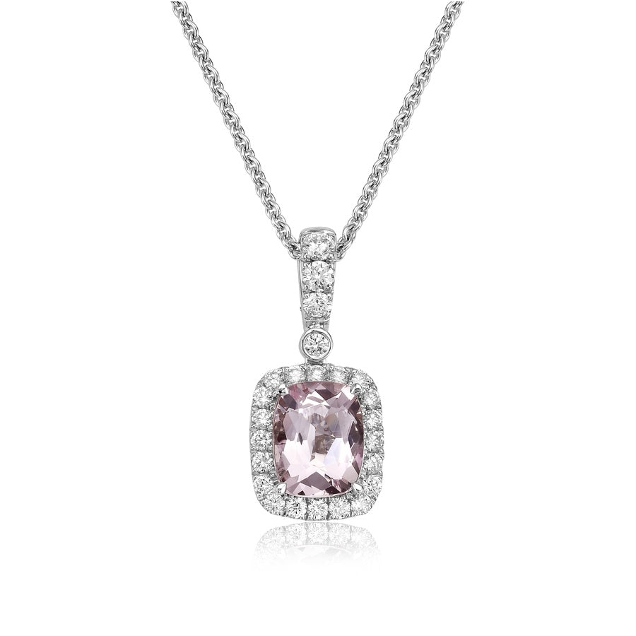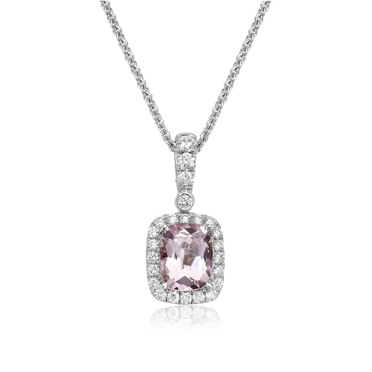 Vibrant cushion-cut morganite pendant, set in 18k white gold, is encircled by a halo of brilliant diamonds, creating a dazzling frame. Attention to detail is evident from every angle, with the back of the pendant featuring vibrant pink sapphires, adding a unique and thoughtful touch.