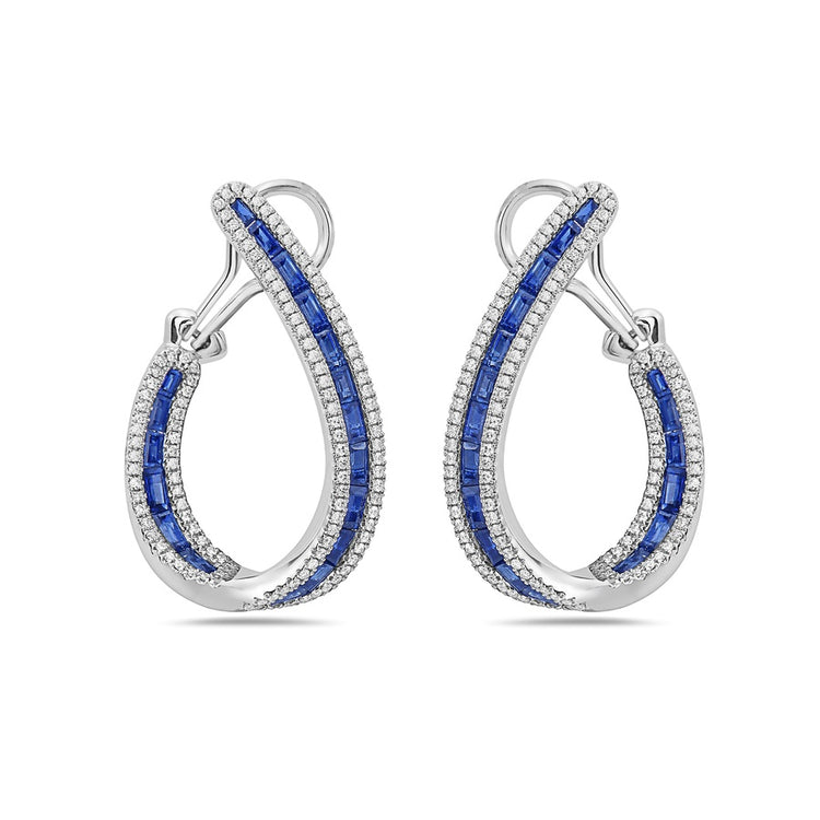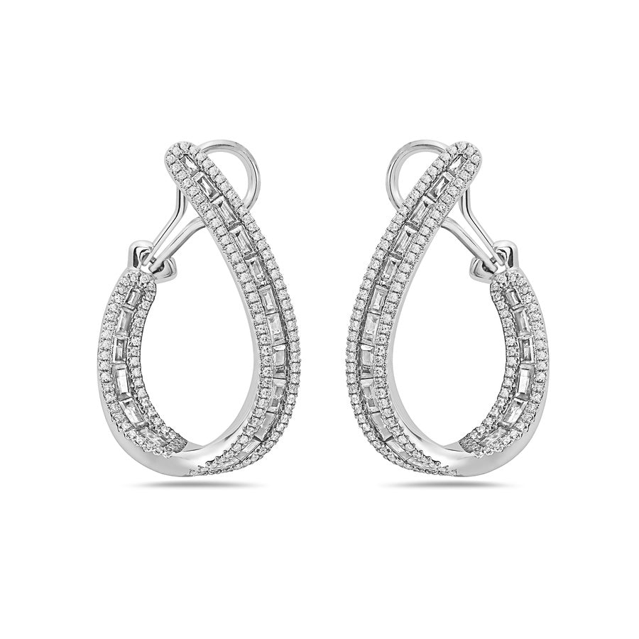 Baguette-cut diamonds are channel-set between two rows of meticulously pavé-set white diamonds in lustrous 18k white gold. Designed to glide gracefully along the ear, these earrings curve elegantly from the front of the lobe to the back, creating a fluid silhouette that casts a radiant glow. The result is a sophisticated, modern design that enhances the natural beauty and grace of the face