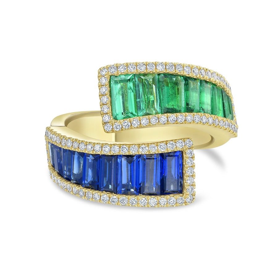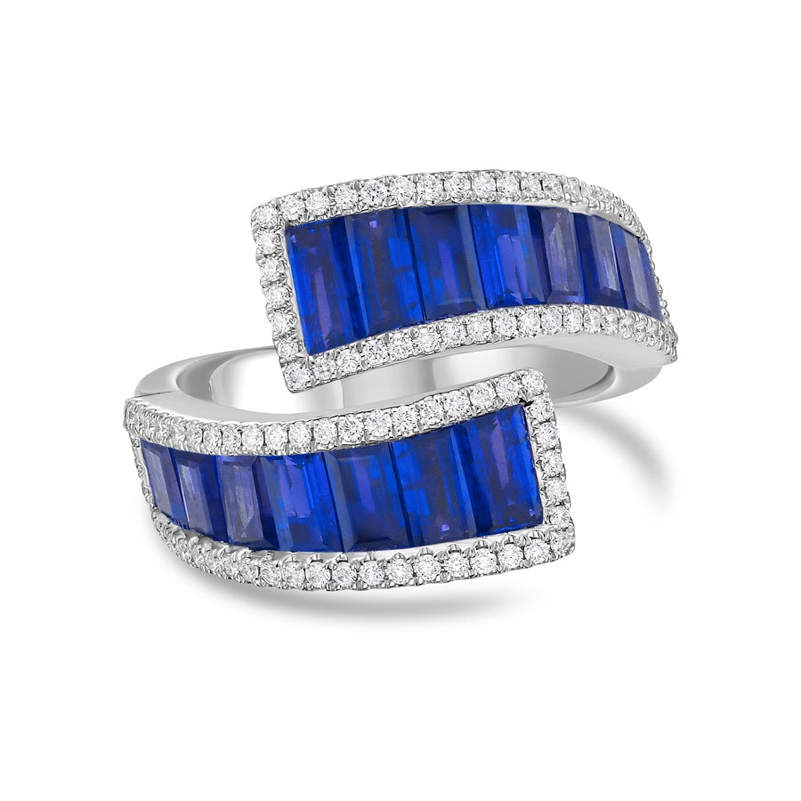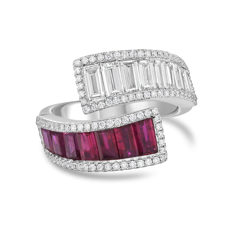 A contemporary bypass ring in 18k white gold, featuring perfectly cut diamond baguettes , accented by a border of round brilliant diamonds. Brilliant diamonds and clean lines come together in a sleek, modern design with timeless elegance.