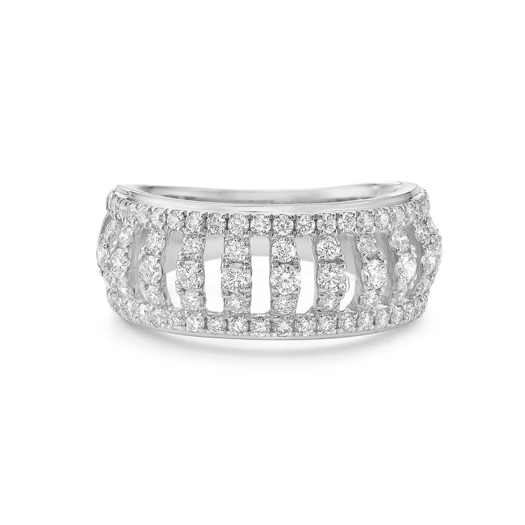 Delicate arms of brilliant white diamonds set in 18k white gold connect two rows of diamonds giving this elevated version of our birdcage band ring an even more elegant appeal.