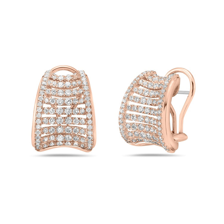 Concave arms of 18k white gold, adorned with brilliant diamonds, gracefully bridge two parallel rows of sparkling diamonds, forming a sculptural, dimensional silhouette. These luminous earrings are finished with secure omega backs.