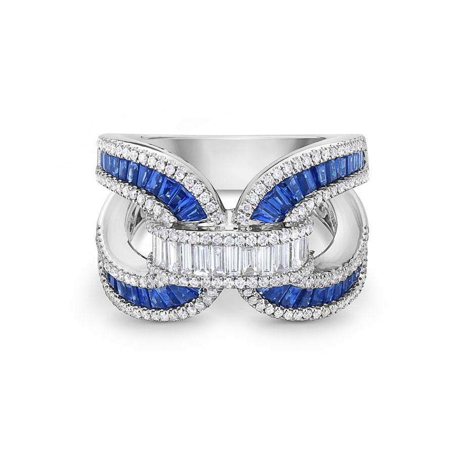Perfectly pave-set brilliant white diamonds are arranged in a graceful curved form of 18k white gold, bridged seamlessly by our signature section of baguette white diamonds.
