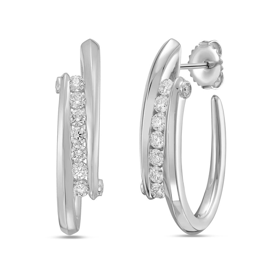 Ideal-cut round diamonds are elegantly secured between two sculpted and graduated walls of solid 18k white gold. Two bezel-set white diamond accents add a refined touch of intricacy and brilliance to each hoop, elevating the design with subtle sophistication.
