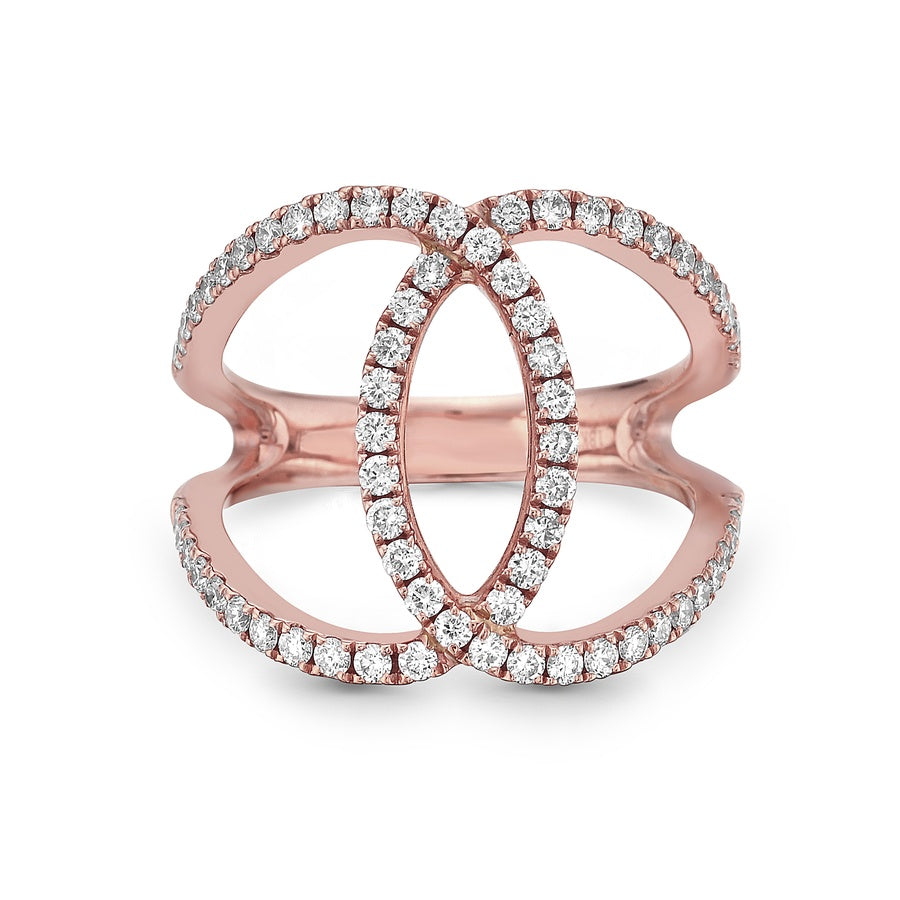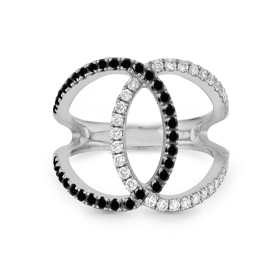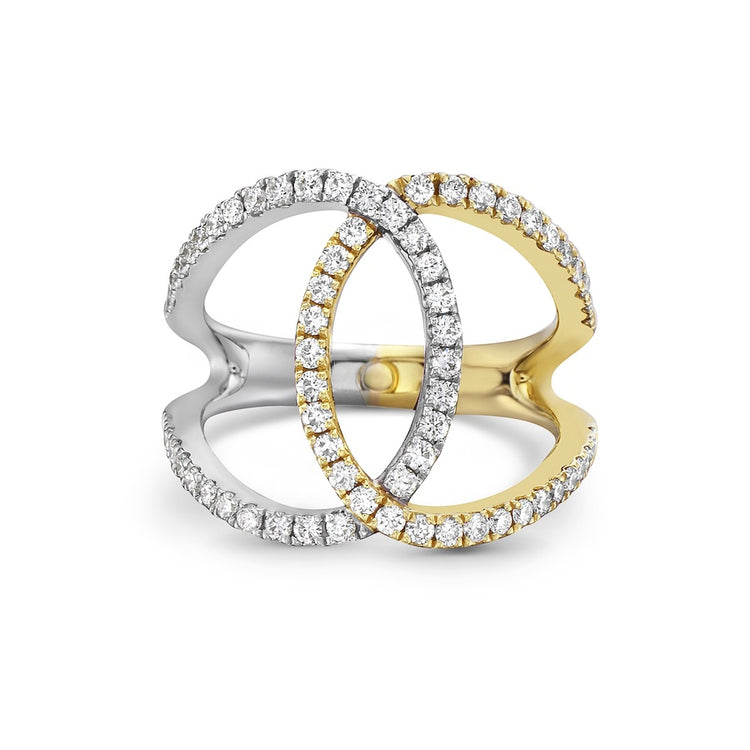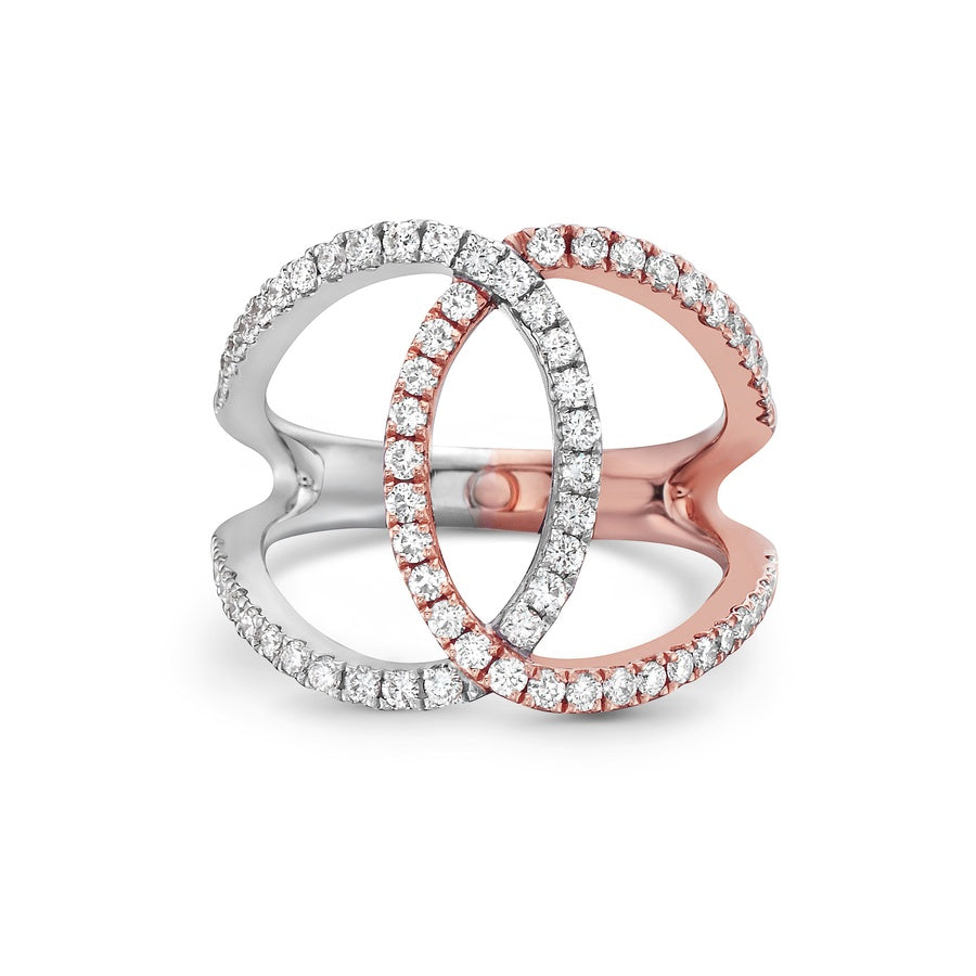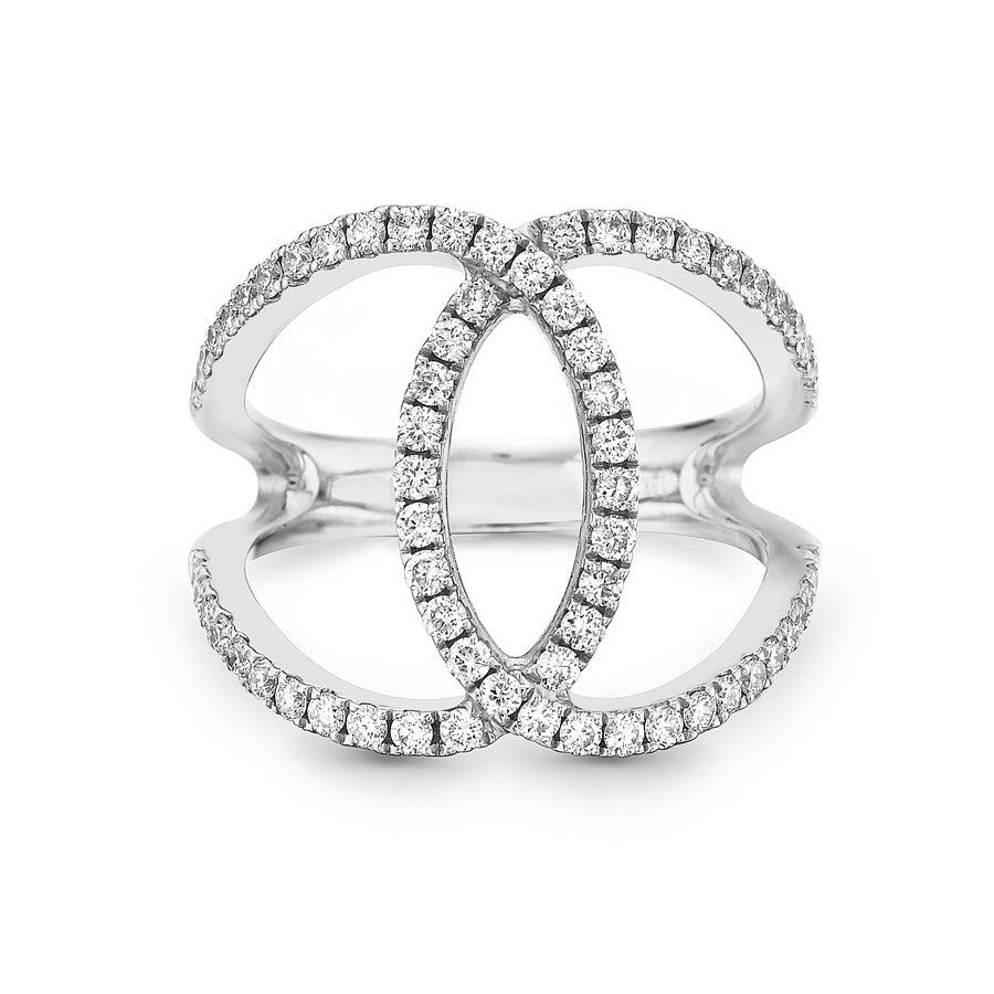 Brilliant white diamonds set in 18k white gold intersect to form a stunning elliptical design, featuring negative space that lends the piece a contemporary, airy elegance.