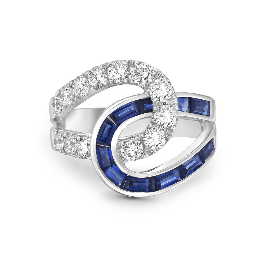 Channel-set diamond baguettes intertwine with brilliant round diamonds to create a true interlocking motion. Sculpture and design come together in perfect harmony to form a beautiful statement ring, expertly crafted in 18k white gold.