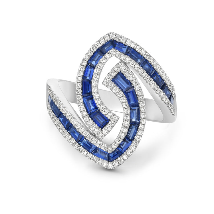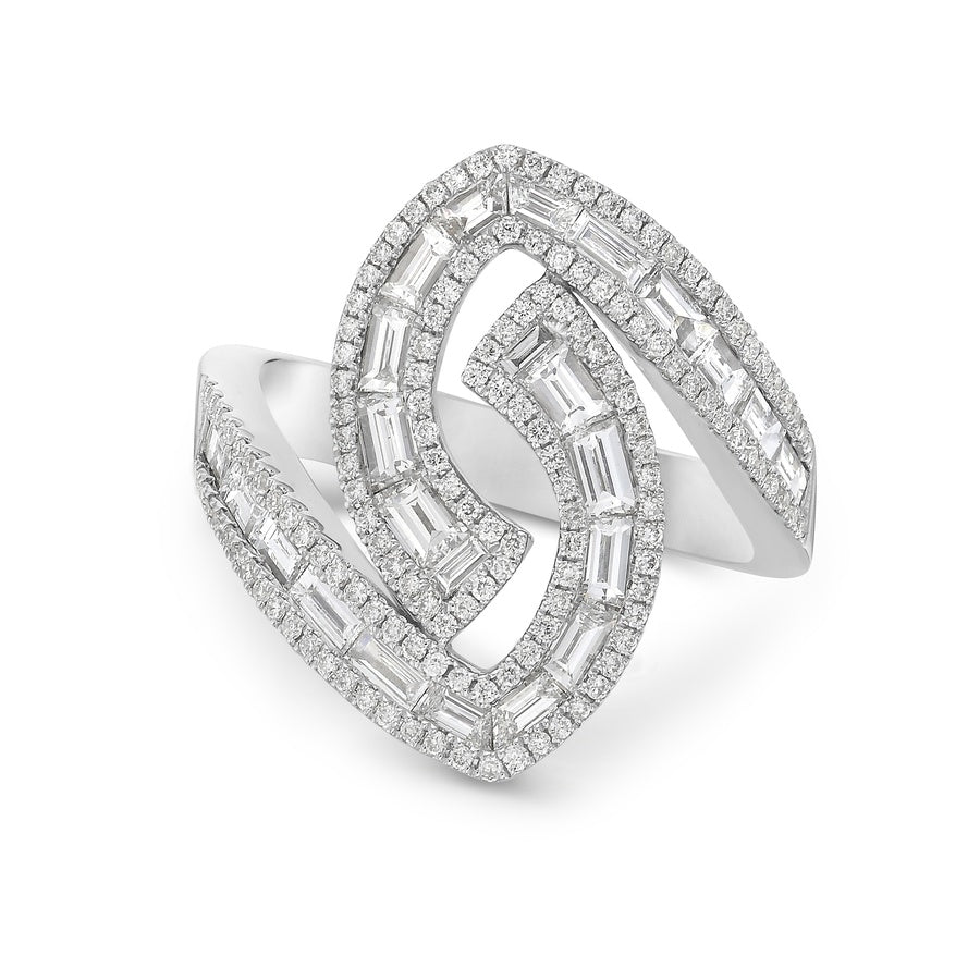 Channel-set white diamond baguettes are framed by walls of brilliant round white diamonds, all set in 18k white gold, to create a striking statement ring that interlocks seamlessly.