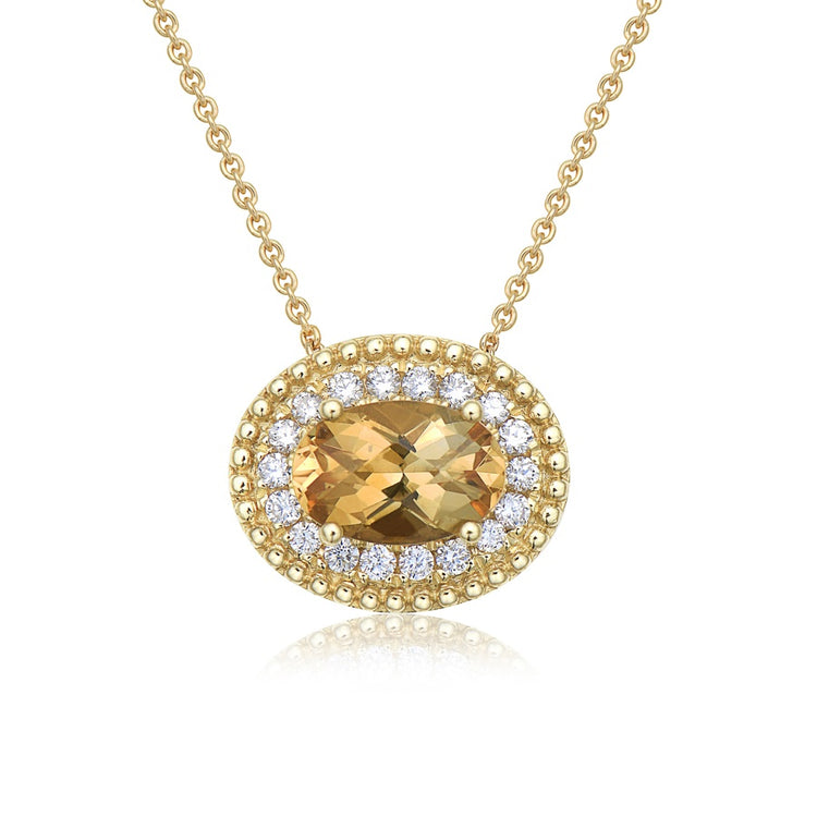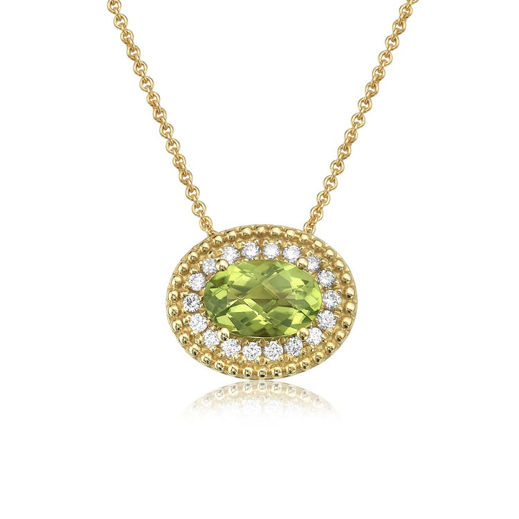 East-to-west set oval green tourmaline, surrounded by a halo of brilliant diamonds and framed with a textured 18k yellow gold border. This necklace is simple yet full of charm—adding a touch of texture and sparkle to elevate your collection with effortless elegance.