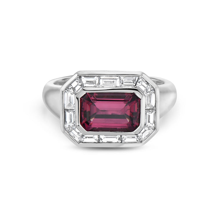 A gorgeous emerald-cut morganite is set east-to-west, framed by precision-cut white diamond baguettes in 18k white gold. The sleek design combines modern elegance with timeless allure.